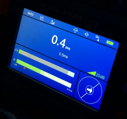 依據(jù)路徑儀和電纜故障*定點(diǎn)儀的測試結(jié)果,我們在161m附近找到了故障點(diǎn)的位置。電纜故障*定點(diǎn)儀在此位置上的測試結(jié)果顯示聲磁時(shí)間差為0.4ms,能夠聽到明顯的放電聲音。結(jié)合路徑儀測試結(jié)果判斷故障點(diǎn)在測試點(diǎn)正下方的1.2米處。