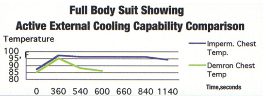 ?實驗條件:工作人員身穿不同防護服,以3.5英里/小時的速度在跑步機上慢跑3分鐘后測量全身防護服的溫度,再隨時間推移不斷測量防護服內的溫度變化。藍色曲線代表通用防護服,綠色曲線代表使用Demron材料制成的防護服。