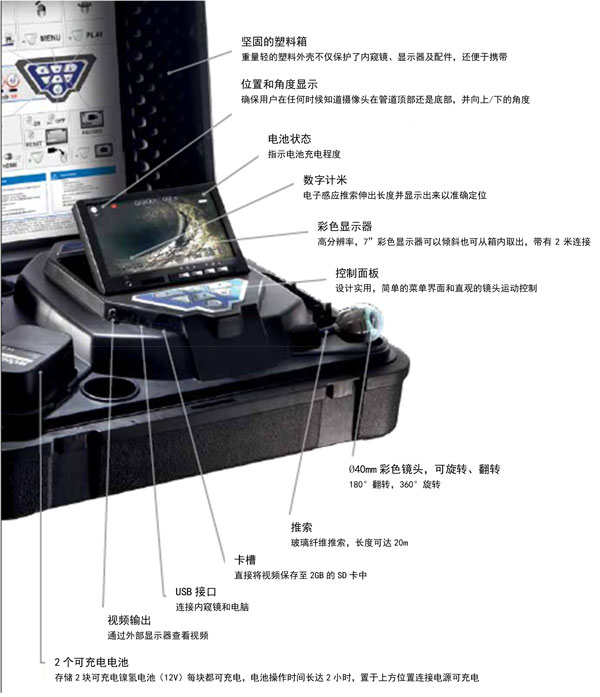 ?該系統由一個帶有卷軸的 20 米長的推索,直徑 40mm 的彩色攝像頭和一個大屏顯示器組成