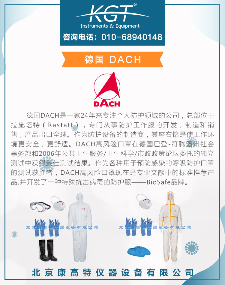 德國DCAH因中國2020年1月份的“新型冠狀肺炎病毒”與北京康高特儀器設(shè)備有限公司有緣合作,并委托康高特為德國DACH防護(hù)服的中國代理。德國DACH防護(hù)服對康高特的信任以及對能力的認(rèn)可,相信我司可以為德國DACH防護(hù)服進(jìn)一步開拓市場、增強(qiáng)市場競爭力,這也對是康高特的大力支持,在市場上的發(fā)展具有重要的意義。