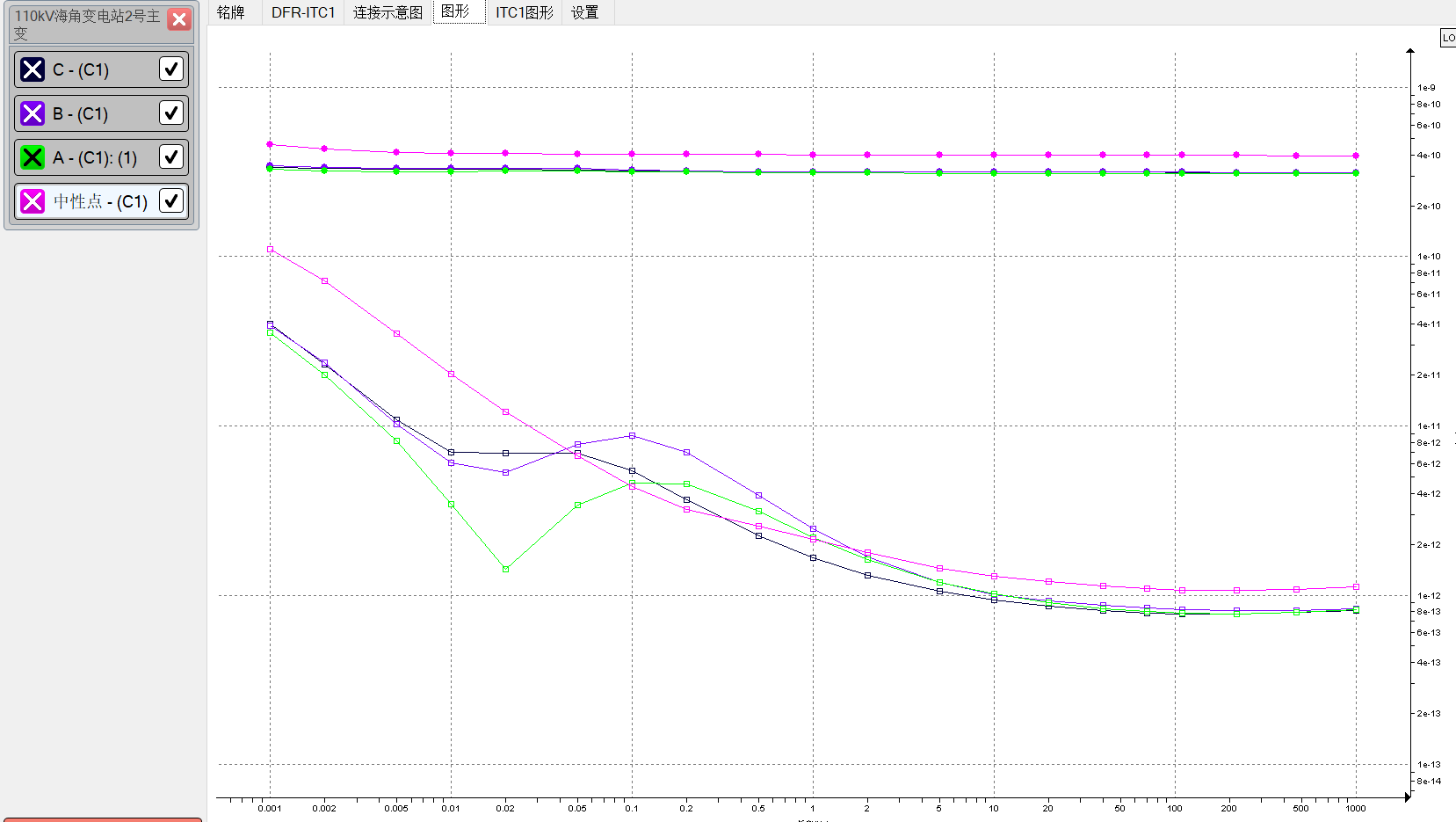 2023年9月3日,南方電網(wǎng)某變電站1號主變,套管FDS試驗。測試高壓側套管A相、B相、C相及中性點四根套管,ITC1測試結果顯示綠色,四根套管的絕緣性能均為新,從介損來看并無異常。