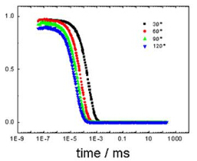 接收器在短時(shí)間內(nèi)多次測(cè)量某一位置光的強(qiáng)度,如果測(cè)量的是小顆粒那么光強(qiáng)度會(huì)很快變化,如果測(cè)量的是大顆粒那么光強(qiáng)變化會(huì)比較緩慢。在某個(gè)點(diǎn),如果時(shí)間t1和時(shí)間t2測(cè)量到的光強(qiáng)完全一樣,那么光強(qiáng)相關(guān)性為1(完全相關(guān)),如果測(cè)量到的光強(qiáng)完全不一樣,光強(qiáng)相關(guān)性為0(完全不相關(guān))。繪制出光強(qiáng)相關(guān)性隨時(shí)間變化的曲線,如下圖所示。